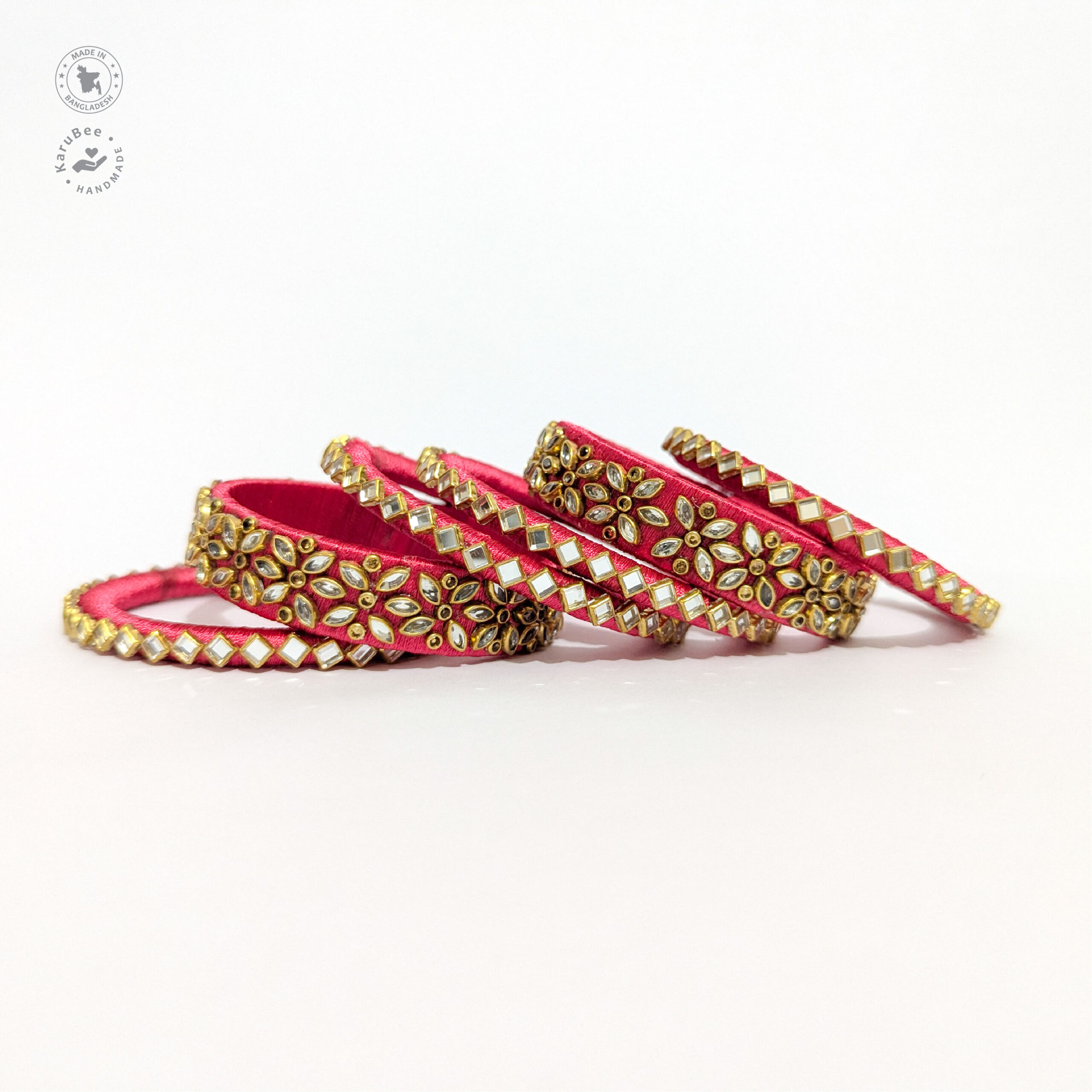 A bold celebration of deep magenta threads intertwined with mirror‑cut gold stones, ROSEMIRA brings a festive sparkle to every gesture. Hand‑wrapped in luxurious thread and detailed with geometric mirror motifs, this bangle set fuses modern glamour with artisanal tradition.
